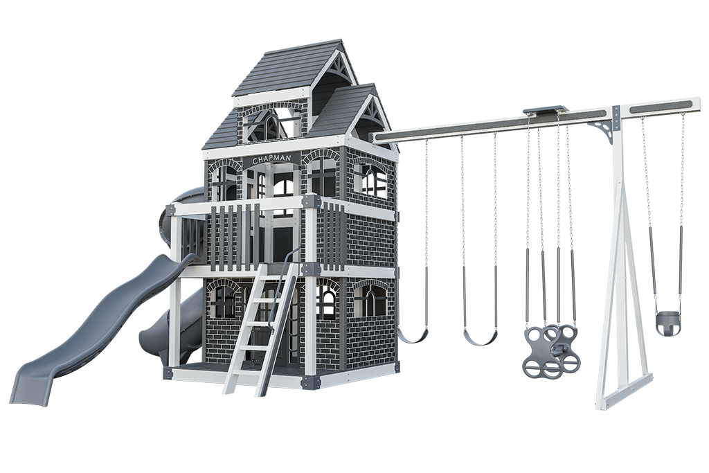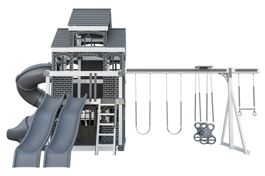 Nothing beats the beauty and strength of our Chapman playsets. These super-massive, manor-like structures, featuring thicker wall materials and our never-splinter safety decking, boast two levels – even accommodating standing adults on the upper deck. Our Chapmans are world-class titans featuring multi-position swing beams for versatile play and super-hefty slides for thrill-seekers.