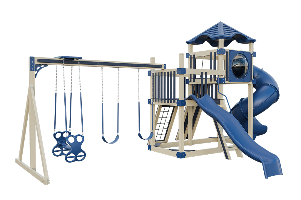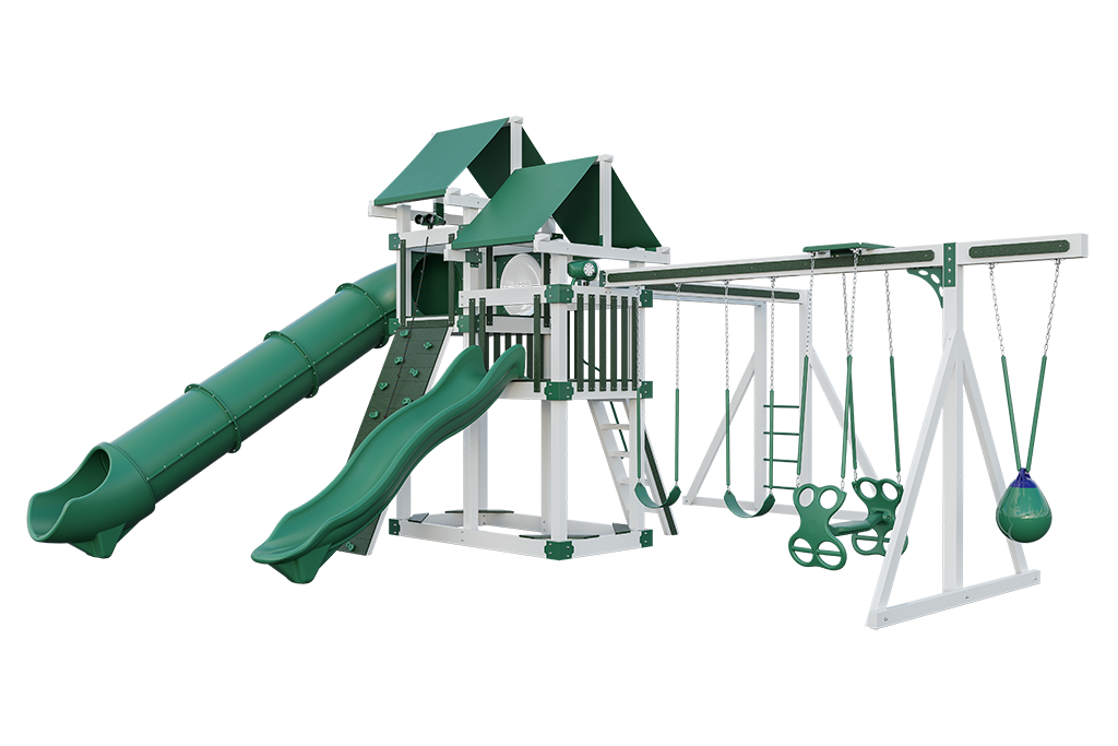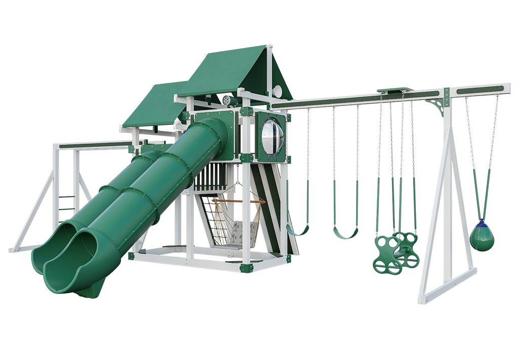 Our 4×8 Denali vinyl playsets are towering backyard fortresses built for big adventure and lasting fun. Designed with twin 4′ x 8′ platforms and heavy-duty vinyl construction, these playsets create spacious multi-level environments where kids can climb, slide, swing, and explore.