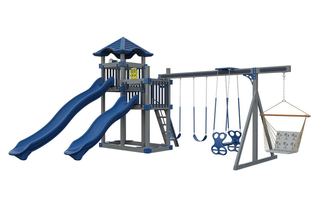 Twin towers shaded by dual tarp roofs provide a spacious play area, while the 10′ high, 4-position swing beam supports multiple swing experiences including belt swings, a dual glider, buoy ball, and hammock swing.