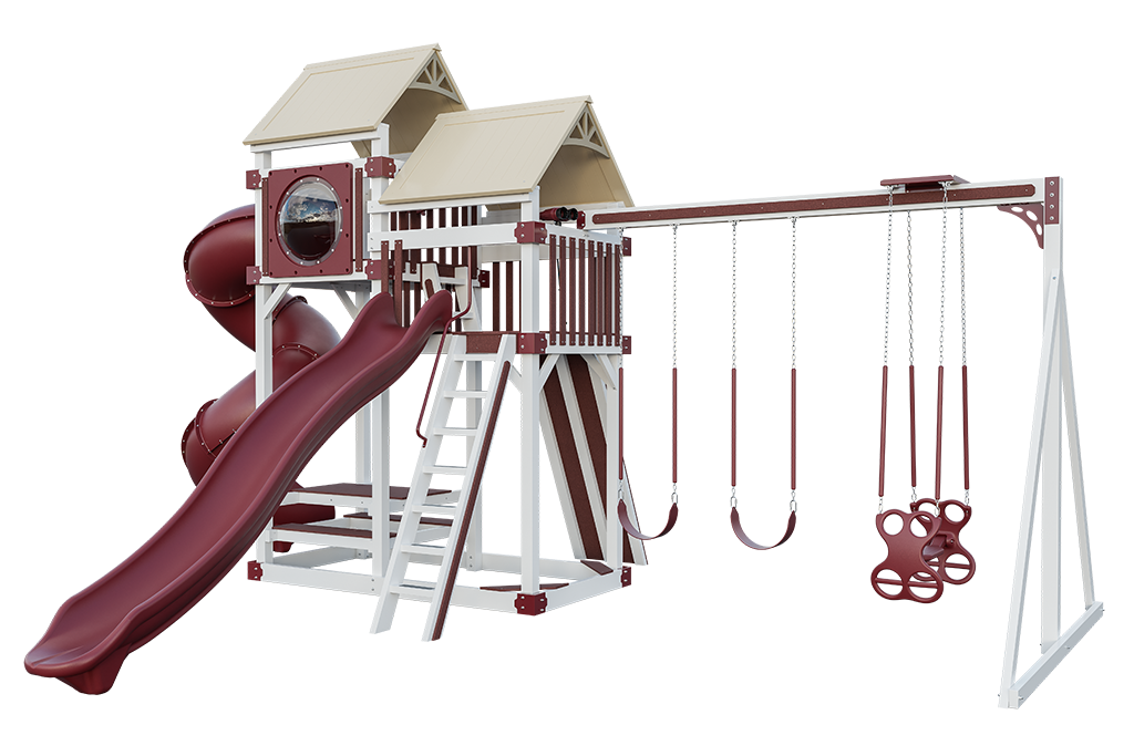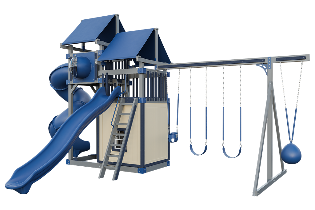One 7′ High Tower | One 9′ High Tower | Two 5′ x 5′ Decks | 10′ High Swing Frame Attachment | Ladder | Ladder HandrailSwipe to see more