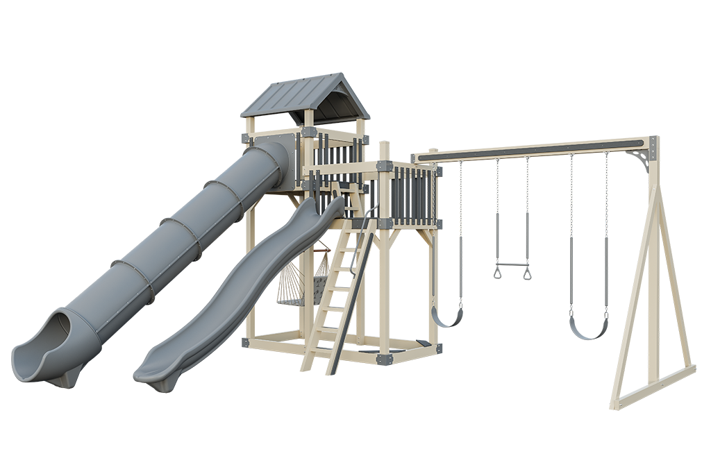 Perfect for larger yards and multi-age play, Rambler Peak playsets can include Tornado Tube, Avalanche, or Sidewinder slides, belt swings, gliders, and even under-platform extras like a 5′ x 5′ picnic table or adult-sized hammock.