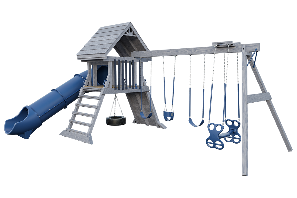 Olympus Layout 2 expands play possibilities with additional swing options and unique features. Finished in Sky Gray stain with a classic wood roof, this Amish-built wooden playset offers durability and modern backyard style.