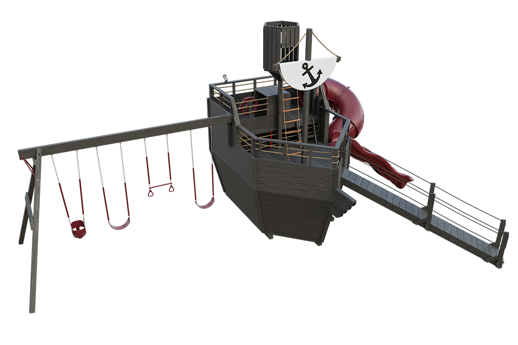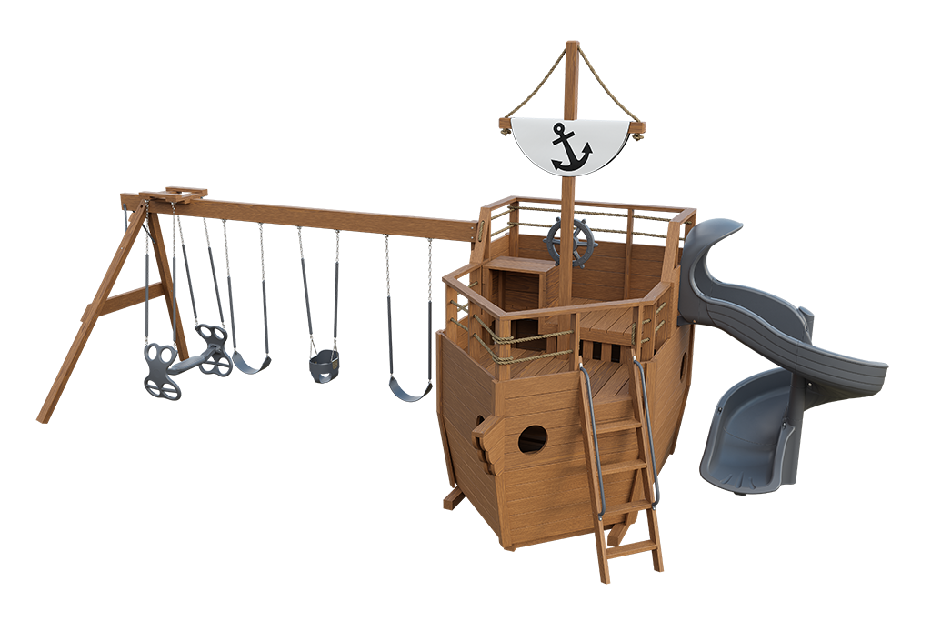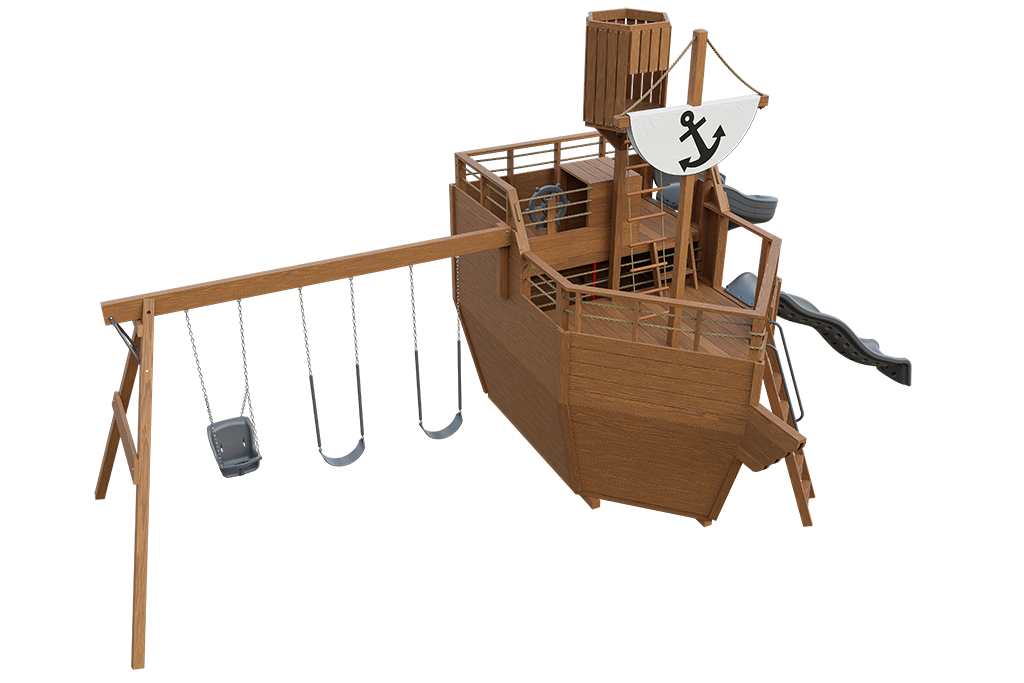 Cutter Layout 3 is designed for families who want more variety and group play in their backyard adventures. Finished in Sepia Brown stain, this ship-inspired wooden playset combines imaginative features with multiple swing options and a unique slide experience.