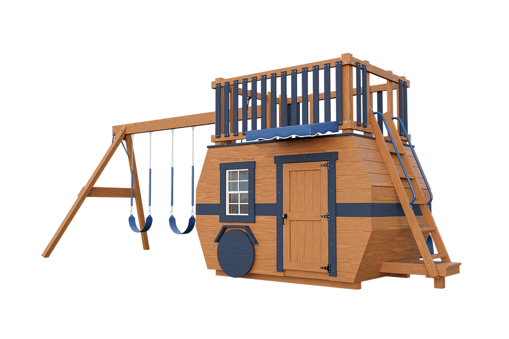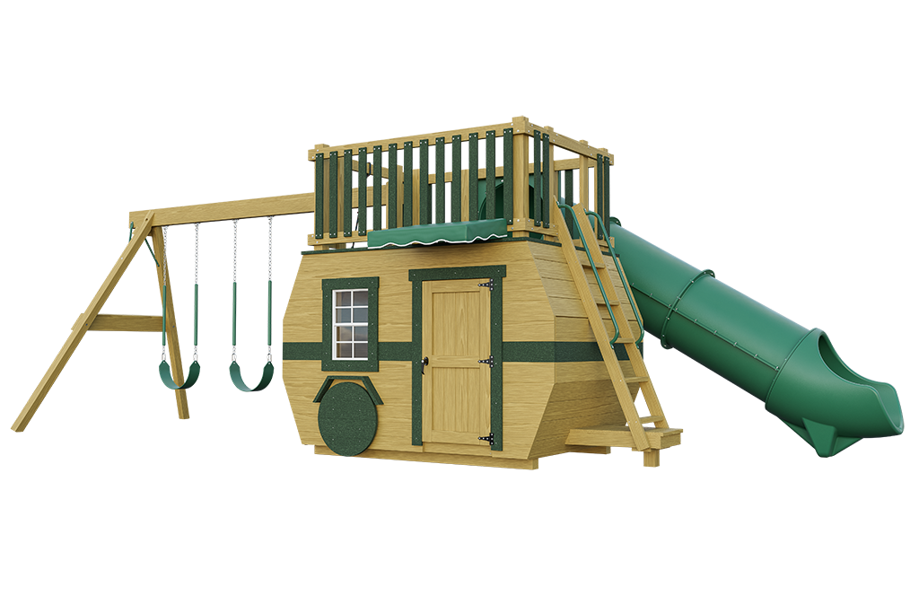 The Scout Layout 2 expands the adventure with more swing options and a longer slide for added excitement. Finished in Sepia Brown stain, this camper-style wooden playset combines a cozy playhouse interior with active outdoor features.