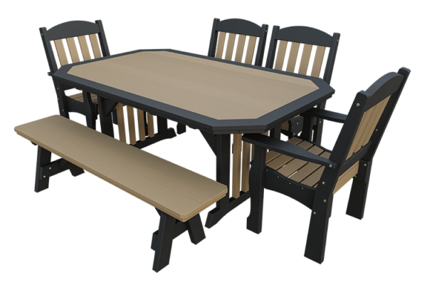 Transform your outdoor dining experience with this 6-piece poly English Garden Dining Set, designed for comfort and style. This set features a 4×6 poly English Garden table, two elegant English Garden armchairs, two matching side chairs, and a 6′ Adirondack bench made from premium, eco-friendly poly lumber. Perfect for hosting family dinners or casual meals with friends, this dining set offers a blend of timeless charm and modern sustainability. Create a welcoming outdoor space to enjoy great food and even better company.
