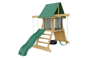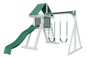 The Vinyl Polar Peak Playset is a compact, durable playset designed for kids from toddlers to youth, perfect for smaller backyards. Its space-saving 3′ x 4′ tower includes a 10’ Wonder Wave Slide and a two-position 8’ high swing beam with two belt swings featuring soft-grip chains, providing hours of climbing, swinging, and sliding fun.